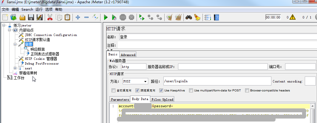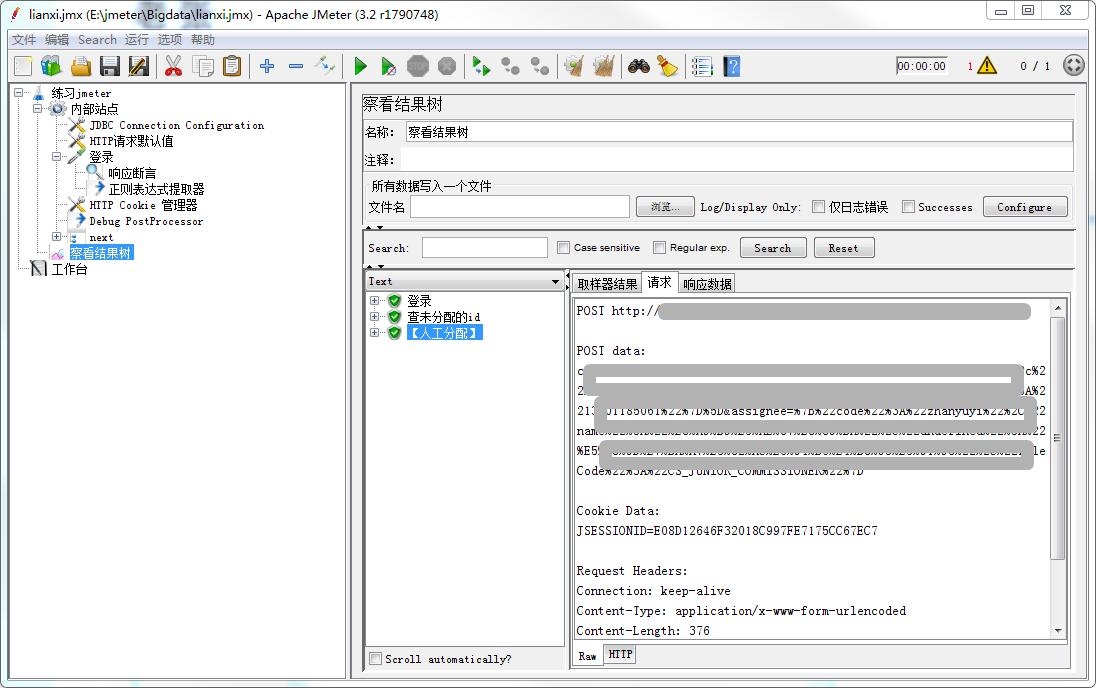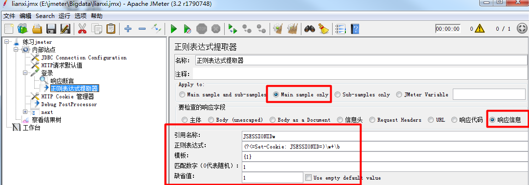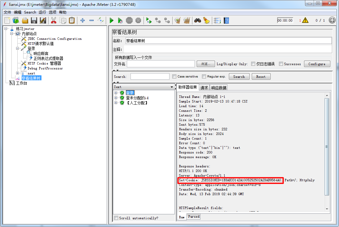 运行一次,在察看结果树看到取样器结果有set-cookie: jsessionid。
