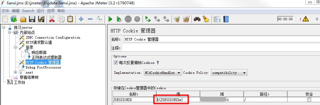 3、在线程组内部站点下创建http cookie管理器,并引用正则表达式提取的引用变量jsessionidw。格式为${jsessionidw}