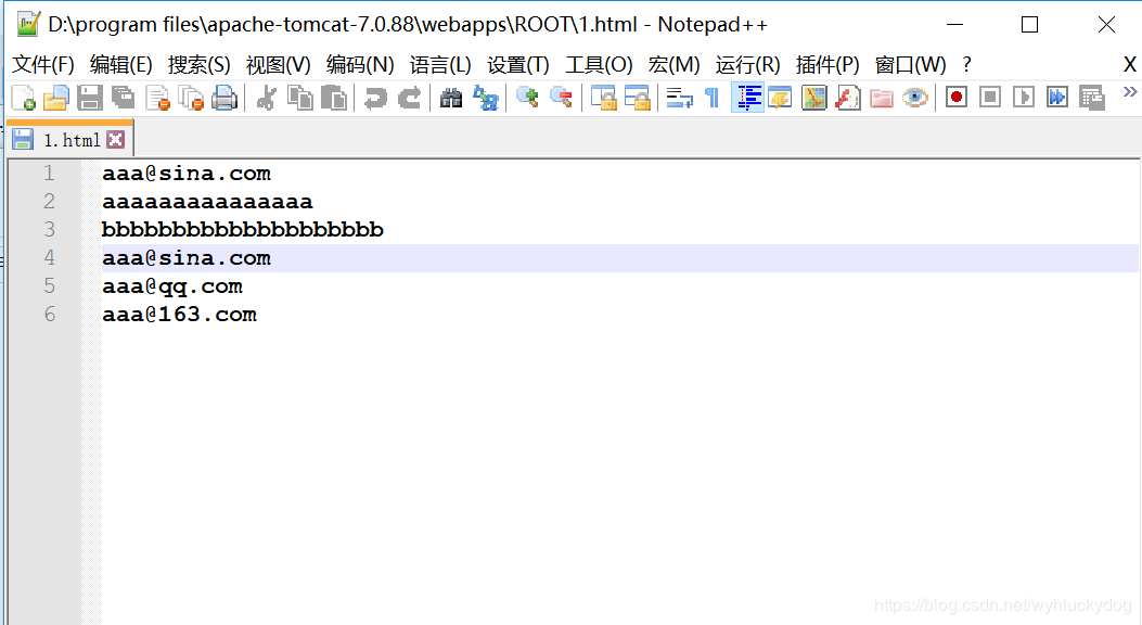 1.为模拟网页爬虫,我们可以现在我们的tomcat服务器端部署一个1.html网页。(部署的步骤:在tomcat目录的webapps目录的roots目录下新建一个1.html。使用notepad++进行编辑,编辑内容为: