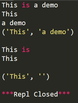 import re s='this is a demo' r1=re.search(r'(.*) is (.*)',s) r2=re.search(r'(.*) is (.*?)',s) print(r1.group()) print(r1.group(1)) print(r1.group(2)) print(r1.groups()) print() print(r2.group()) print(r2.group(1)) print(r2.group(2)) print(r2.groups())