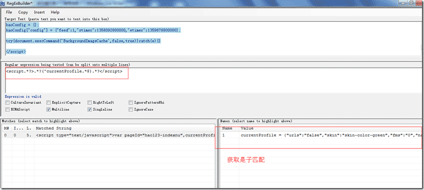 后记:s,m 修饰符只对,几个特殊元字符有改变。如果你正则表达式中没有那几个元字符。开启s,m字符前后将没有什么变化的。对于上面读取hao123.com代码,我们可以继续同时使用s,m模式。如:”%<script.*?>.*?(^currentprofile.*$).*?</script>%sm” ,匹配所有script标签,并且里面js代码,有一行以curentprofile开头字符串。(以下是正则表达式,单行多行一起使用)