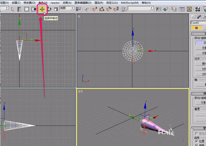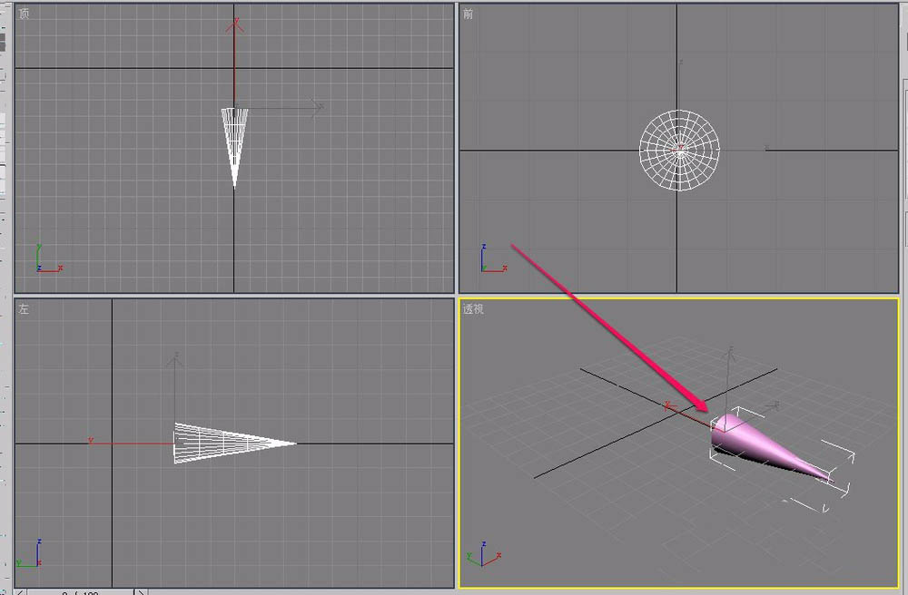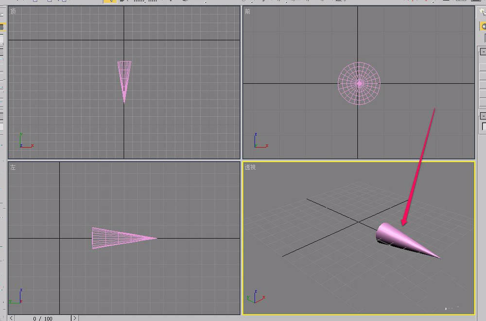 1、打开3ds max软件,新建一个圆锥体,并且把圆锥体放置成图示的状态。