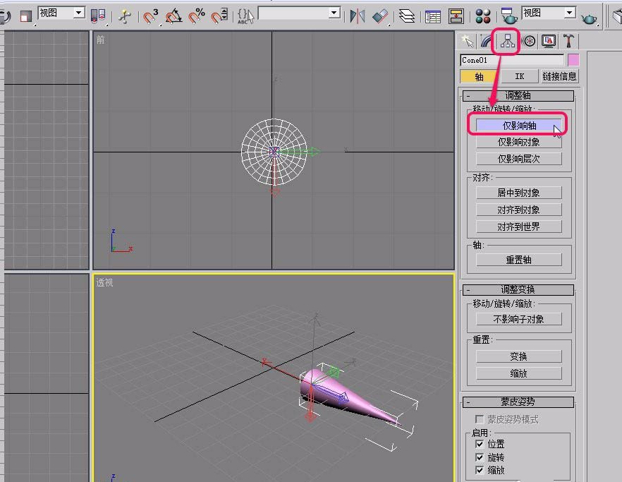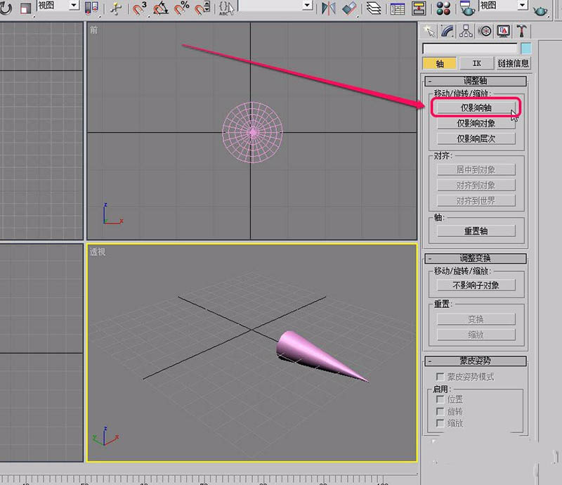 3、打开“层次”选项卡,单击选择“调整轴”卷展栏中的“仅影响轴”按钮。