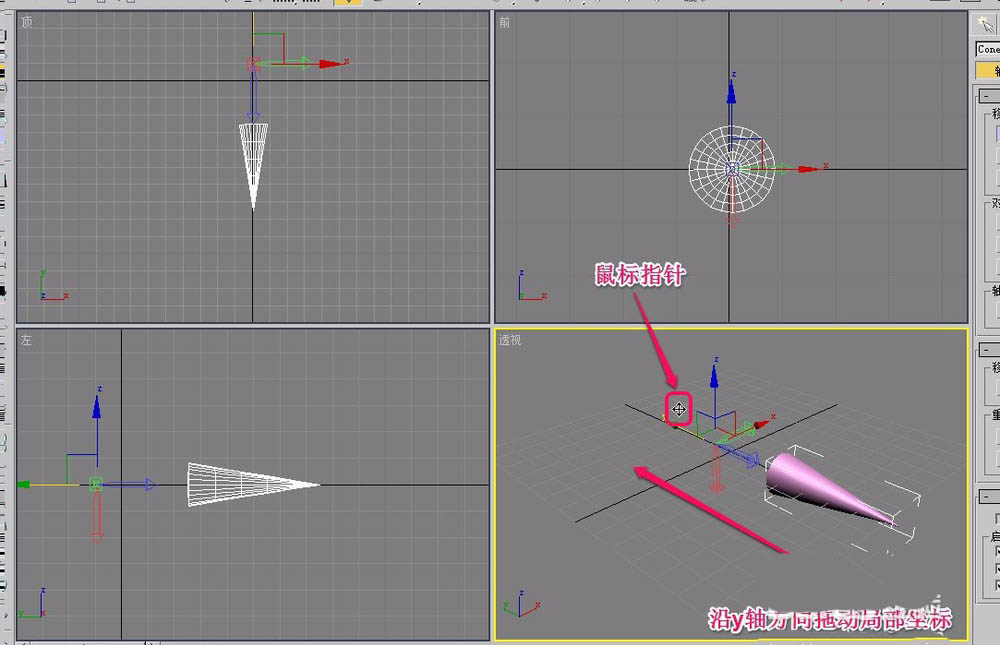 5、使用鼠标沿着 y 轴方向拖动圆锥体的局部坐标,移动一段距离后松开鼠标键。