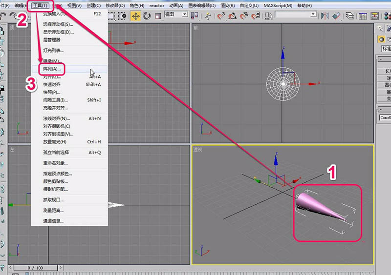 7、用鼠标选中圆锥体,然后选择“工具”菜单中的“阵列”命令。