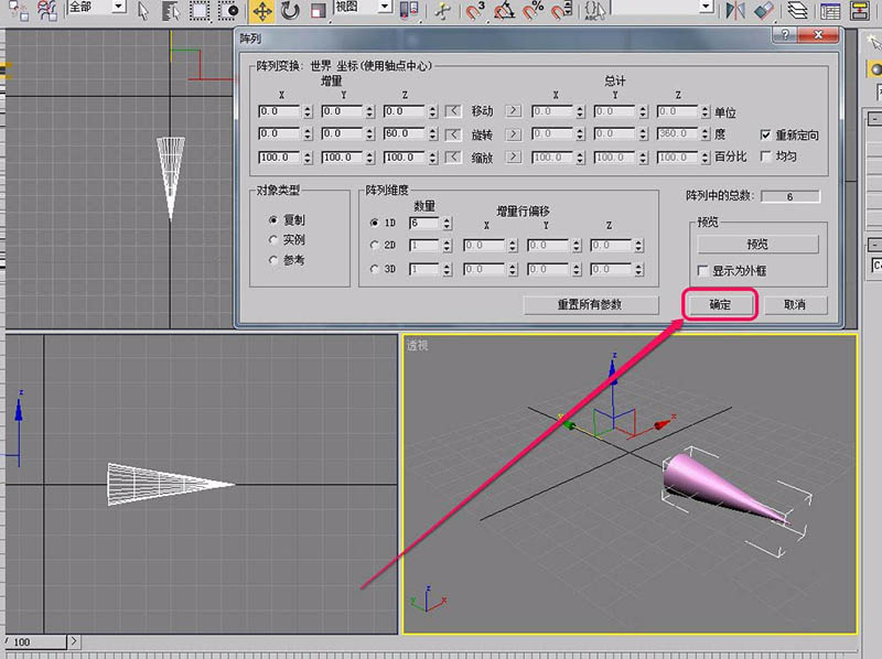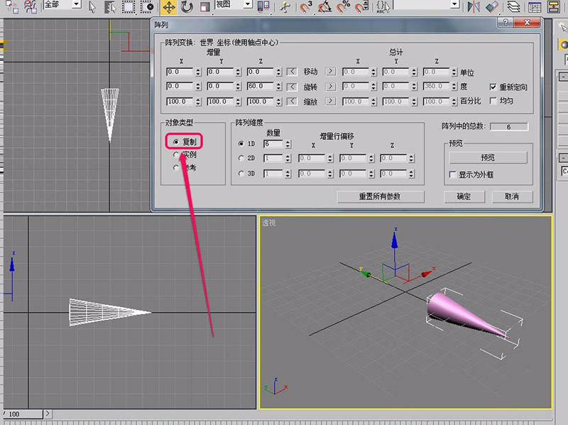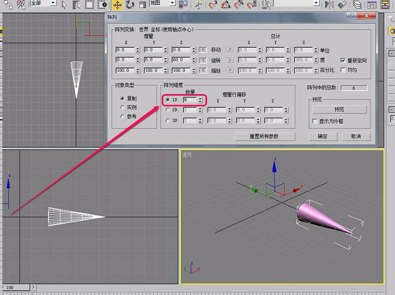 10、进一步,我们将“阵列维度”中的“1d”数量设置为 6 ,表示阵列出6个圆锥体。