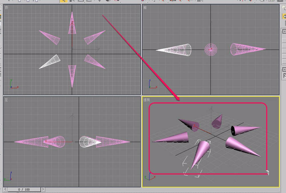 12、可以看到,软件旋转复制出了6个圆锥体。