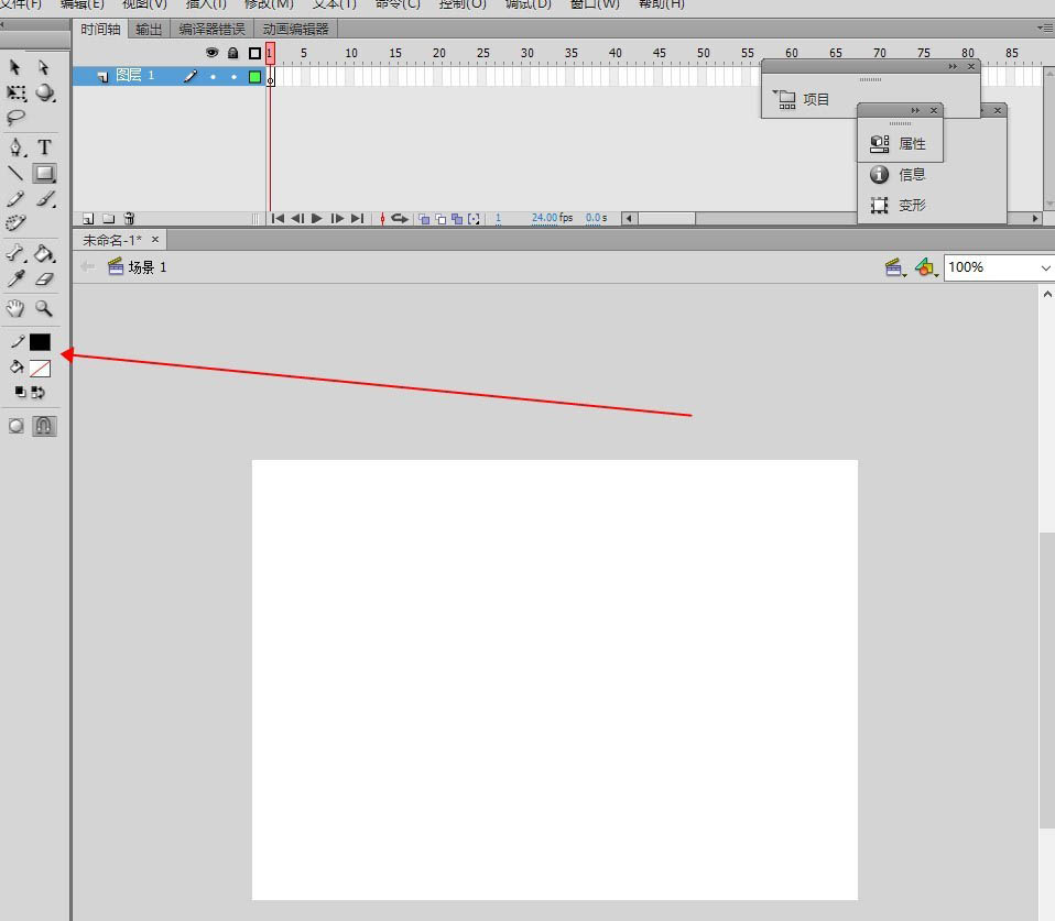 1、打开flash软件,新建文档,修改笔触颜色黑色,大小5,如图