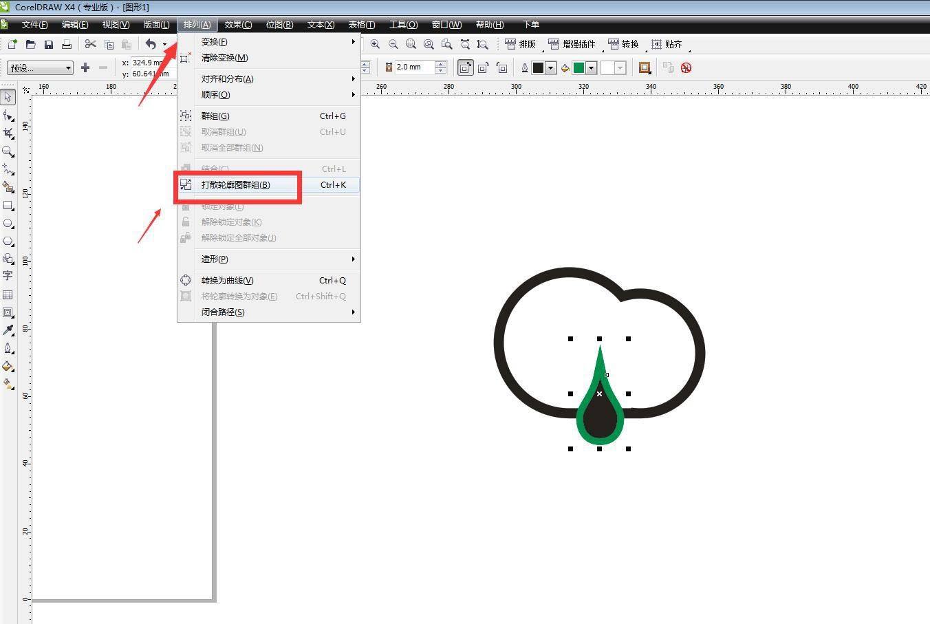 在排列菜单栏中选择打散轮廓图群组,将其拆分。