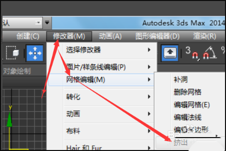 6、然后在工具栏选择修改器——选择网络编辑——挤出;