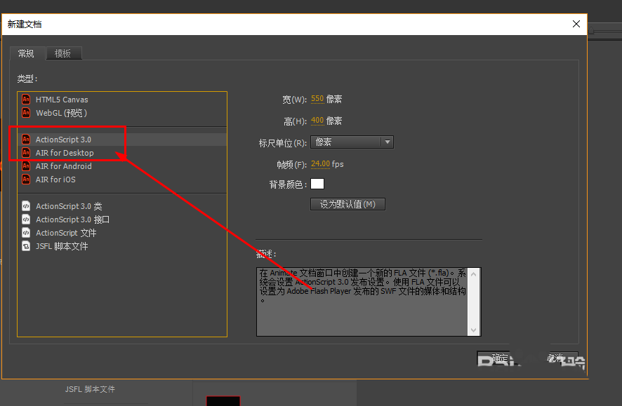 1、打开软件,这里是animate软件,新建一个flash文档。