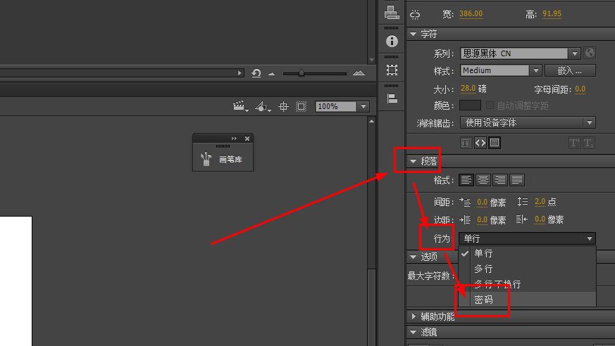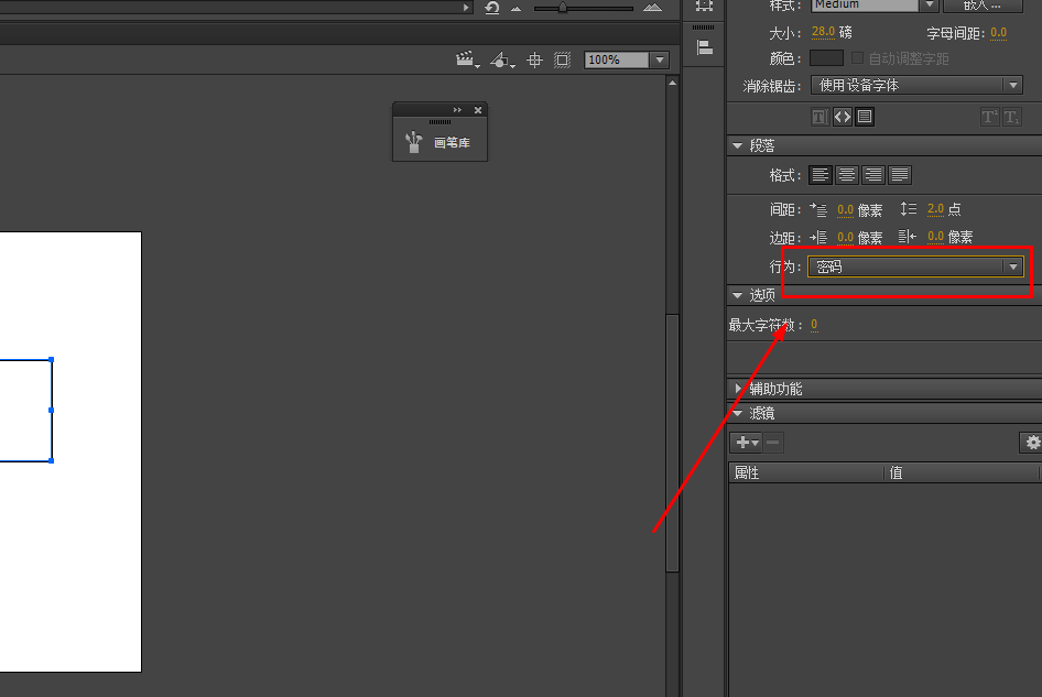 5、这时选择输入文本框,在属性中找到段落--行为--密码