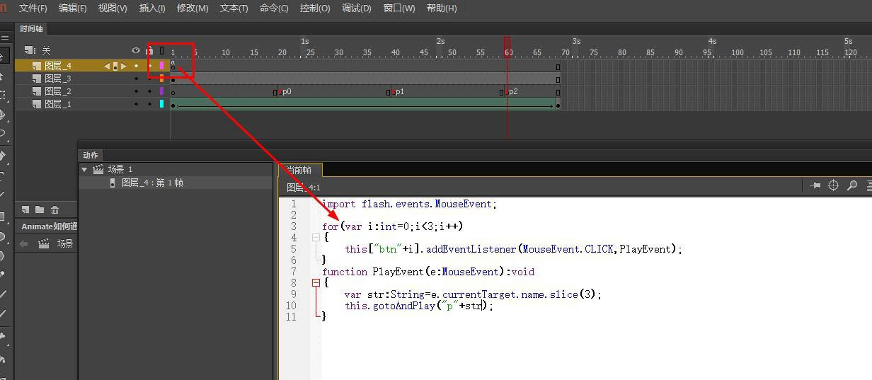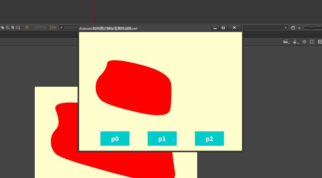 9、运行后就可以点击三个按钮直接跳转到对应的帧标签开始播放