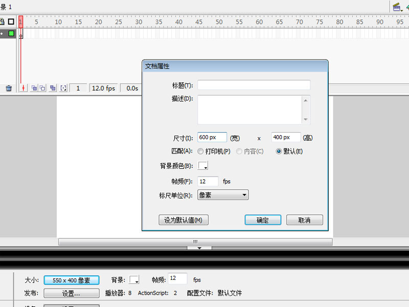 1、启动flash后,新建一个大小为600*400,帧频为12fps,背景颜色为白色的文档。