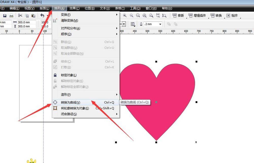 3、将心形转化为曲线。在排列菜单栏下,有一个转化为曲线,这是为了编辑心形,改变他的形态