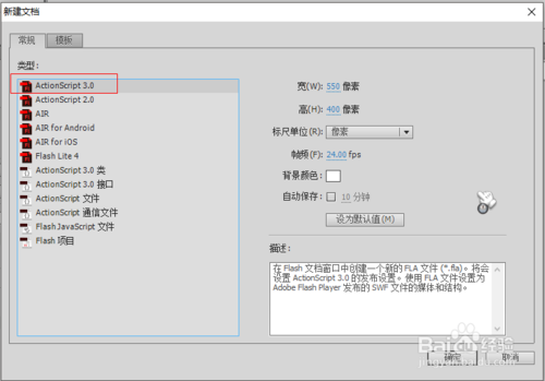 3、接下来开始制作flash小游戏,新建actionscript3.0文档,注意小游戏的画面大小设定。