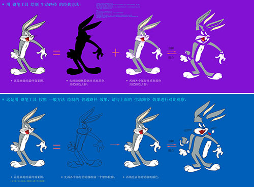 下面这张图像,上半部分是我对 兔八哥ai矢量素材源文件 的图解分析,下半部分是我在困惑时期用钢笔工具按照一般的方法绘制的兔八哥形象。你可以上下对比一下两种不同的轮廓效果。