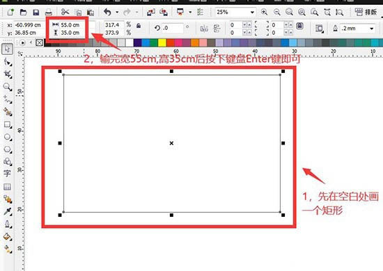 3、在空白处随便画一个矩形后在编辑栏输入矩形的宽高值按下enter键。(这个数值根据自己需要的模板大小来设置)