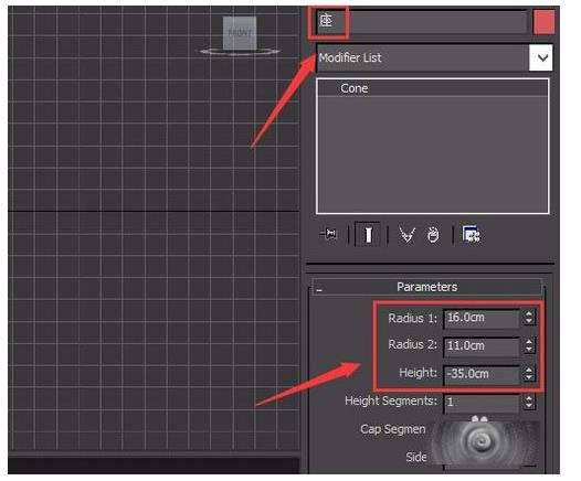 4、选择创建的cone物体,在modify里修改名字为座,并调节其参数如图: