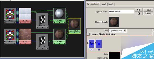 处理好各自的bump后。把遮照贴图用中键拖拽到旧材质的transparency节点上