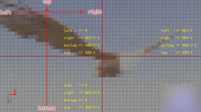 第一块的图像是:left == 0right == 864/2-1bottom == 480/2-1top == 480-1-1的原因是象素是从0开始的,比如一个640×480的图,x象素是从0~639。y象素是从0~479;