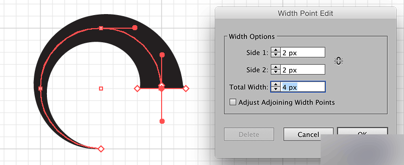 选择宽度工具(shift-w),双击需要编辑的节点后,会出现控制面板供输入数据精确控制宽度。该工具可以精准绘制出其它工具所无法绘制的图形。
