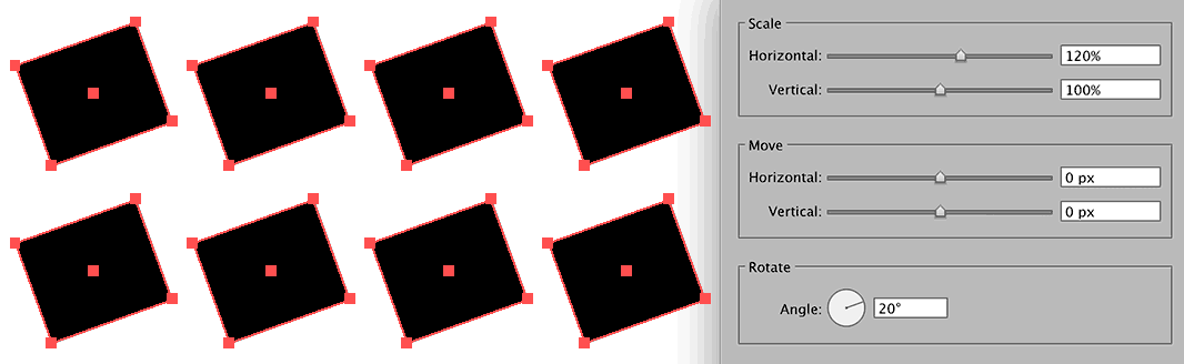 在 illustrator 中,同时对多个对象进行大小、旋转角度及位移等调整是相当轻松的,并且它还能做到以每个单独物体为单位进行上述各类调整。这个小小的功能可以为我们省去大量的时间和精力。