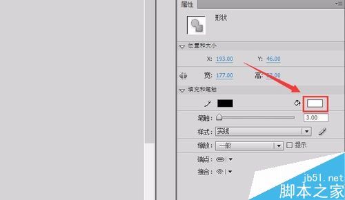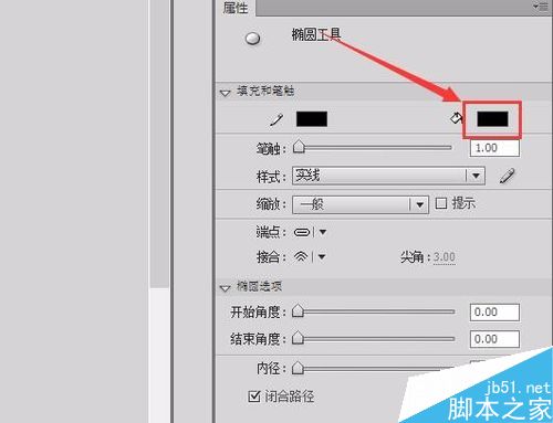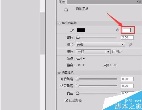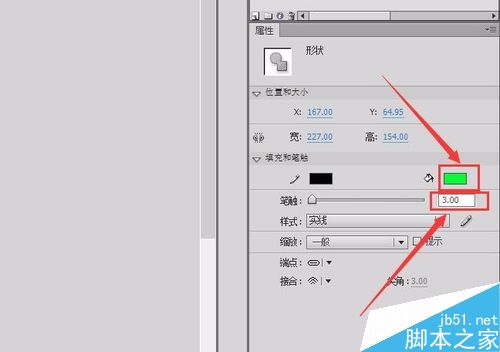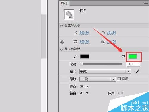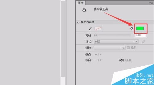 4、选择这个椭圆工具在属性里设置填充色为草绿色,笔触大小为3,如图所示: