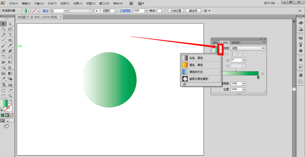 3、如何把我们刚才自己调整好的颜色存储起来呢?我们点击渐变图标旁边的下拉三角形按钮,可以看到里面有几个是自带的渐变颜色