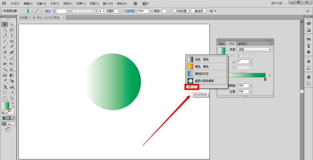 4、接着,在刚才弹出来的下拉面板的底下有个“添加到色板”的按钮,点击它