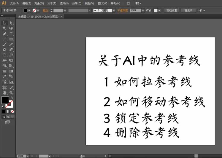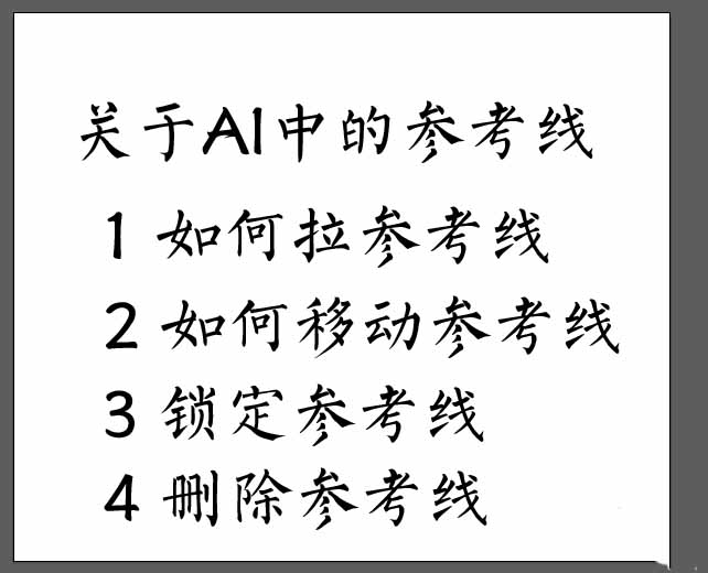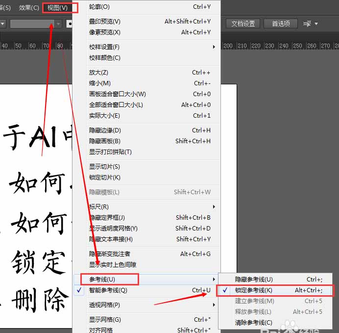 6、第三个锁定参考线 如图 视图-参考线-锁定参考线 勾打上的(这个是ai默认的状态) 勾打上了 可以拉出参考线 但是无法对参考线进行移动和删除
