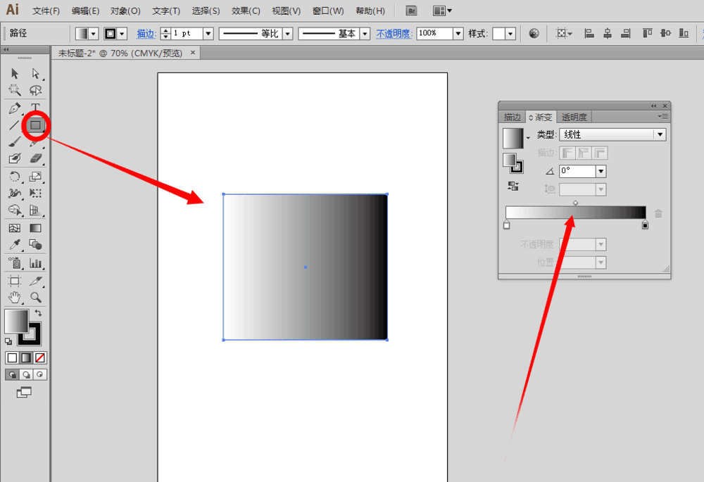 1、随意在画布上绘制一个矩形,并且点击渐变面板上的渐变滑块,填充上黑白渐变色