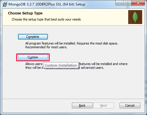 通过点击 "Custom(自定义)" 按钮来设置你的安装目录,我将其安装在D:\MongoDB