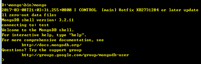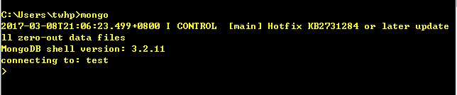 如果不报错,那么已经成功了,此时,不要关闭终端,不要关闭,因为这是在启动服务,你关了之后是没法用的。另外开一个终端,输入mongo,显示如下,那么你可以使用mongo了。