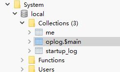 此时,我们可以在Mongo的系统库local里见到新增的collection——oplog,此时oplog.$main里就会存储进oplog信息,如果此时还有充当从数据库的Mongo存在,就会还有一些slaves的信息,由于我们这里并不是主从同步,所以不存在这些集合。