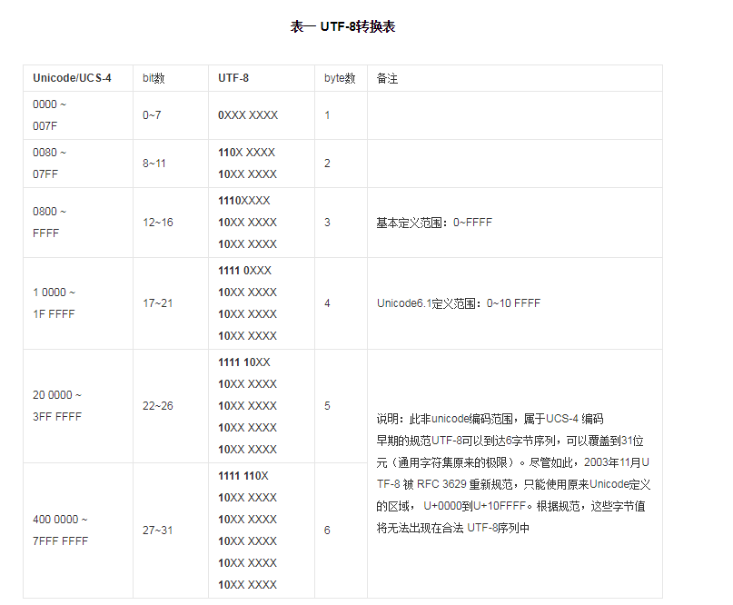 UTF-8编码规则:如果只有一个字节则其最高二进制位为0;如果是多字节,其第一个字节从最高位开始,连续的二进制位值为1的个数决定了其编码的字节数,其余各字节均以10开头。UTF-8转换表表示如下: