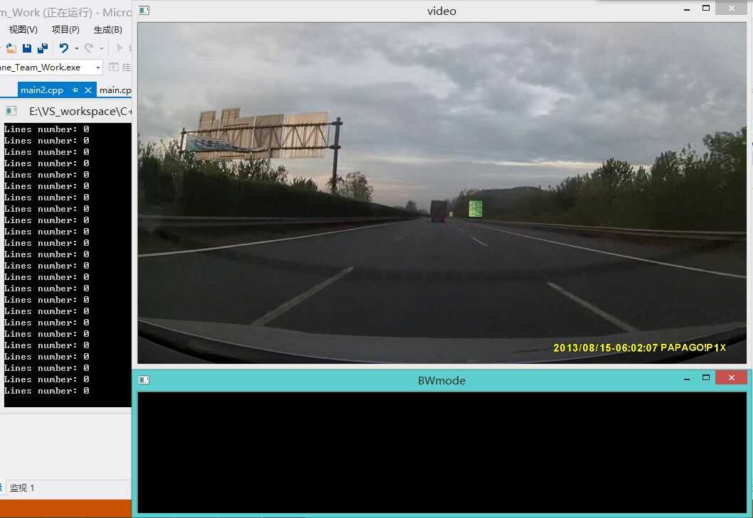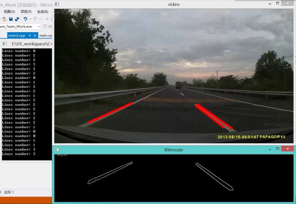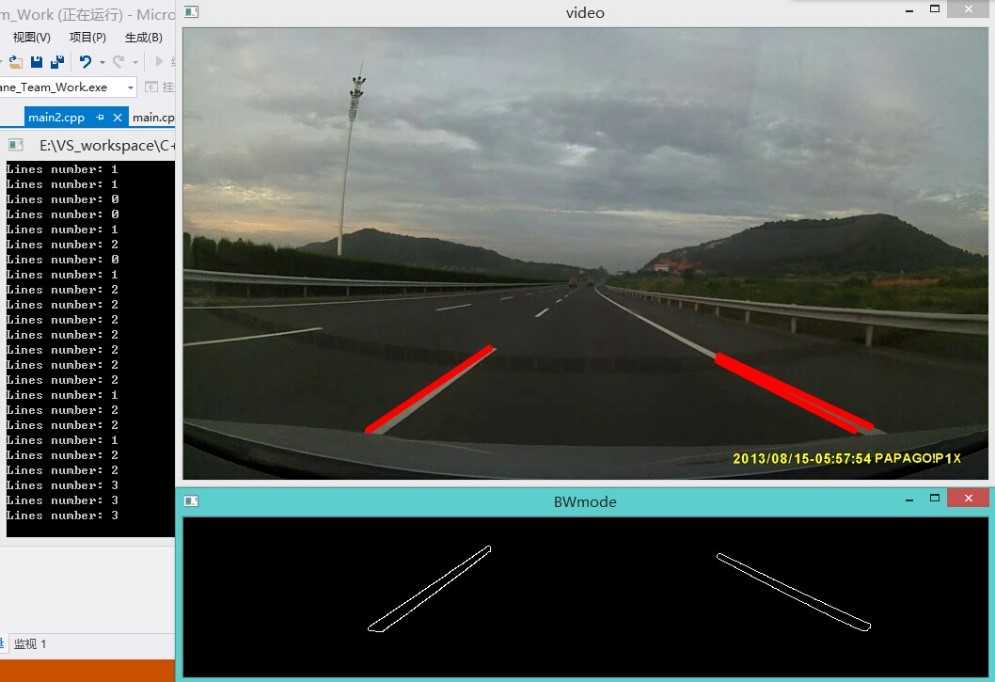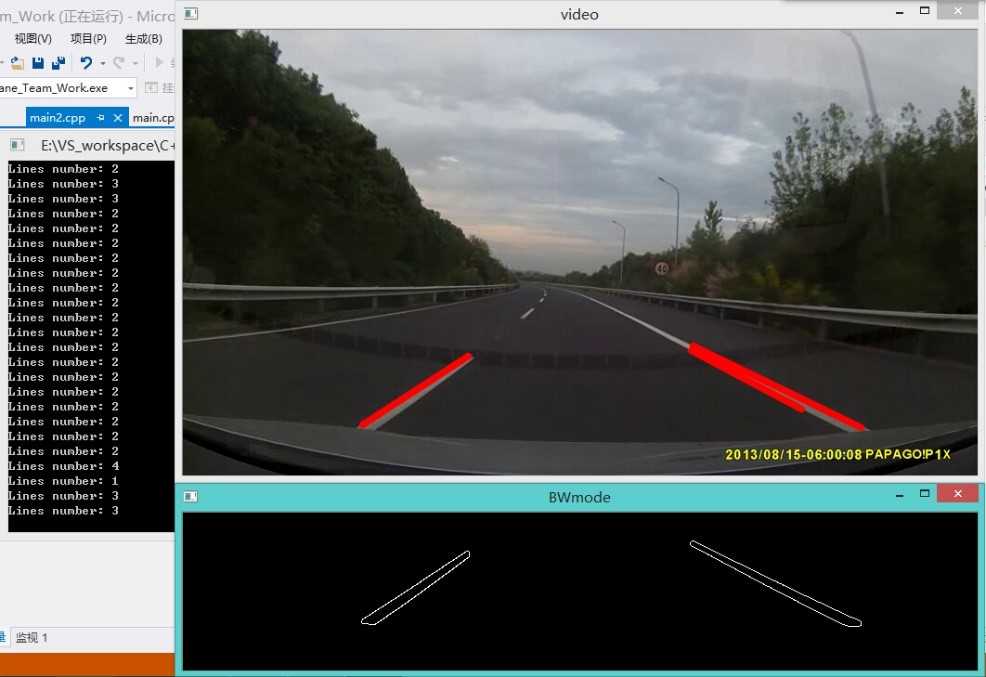 - 直线检测:实现了两种方法 1>使用opencv库封装好的霍夫直线检测函数,在原图对应区域用红线描出车道线 2>自己写一种直线检测,在头文件中,遍历ROI区域进行特定角度范围的直线检测。两种方法均可在视频中体现,第一种方法运行效率较快。