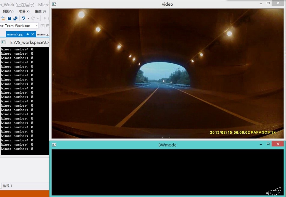 刚进入隧道时,摄像机光源基本处于高光状态,拍摄亮度基本不变,二值化图像时情况良好,噪声比较多但是没产生多大线状影响;当摄像头自动调节亮度,图像亮度变低,二值化时同一阈值把车道线给过滤掉,造成无法识别车道线的现象。