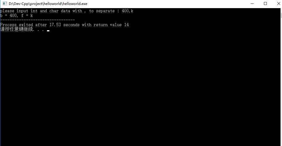 注意:在代码的scanf中,有用逗号,来隔开b和f的取值,所以在屏幕输入的时候,也要用逗号隔开整型和字符型,最后回车键显示结果。