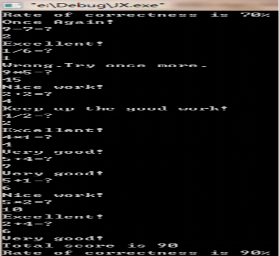 /*a,b随机整数,userAnswer是用户答案,i是控制循环的变量,rightNumber是正确答案数,flag成绩标志,当成绩<75分,其值为1*/
