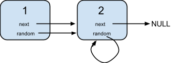 {"$id":"1","next":{"$id":"2","next":null,"random":{"$ref":"2"},"val":2},"random":{"$ref":"2"},"val":1} Explanation: Node 1's value is 1, both of its next and random pointer points to Node 2. Node 2's value is 2, its next pointer points to null and its random pointer points to itself.