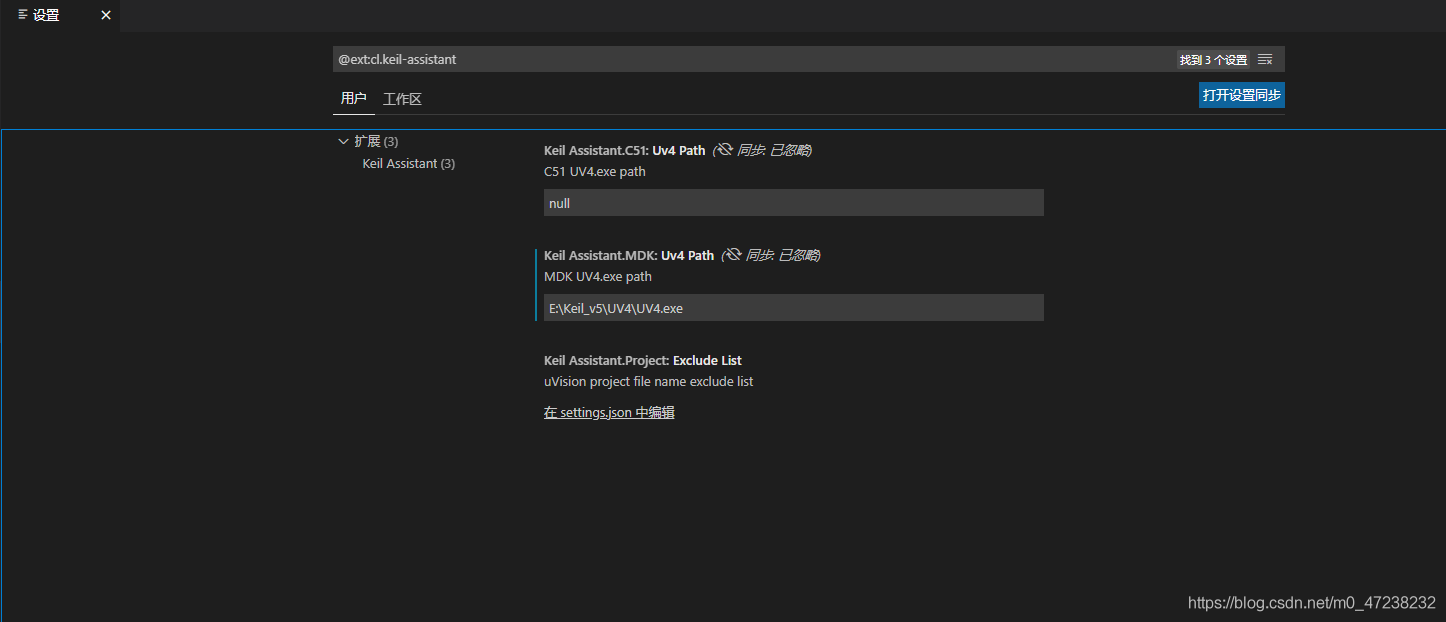 2.进入VScode的扩展界面,选中Keil Assistant右下角的齿轮,点击扩展设置,进入Keil Assistant设置界面
