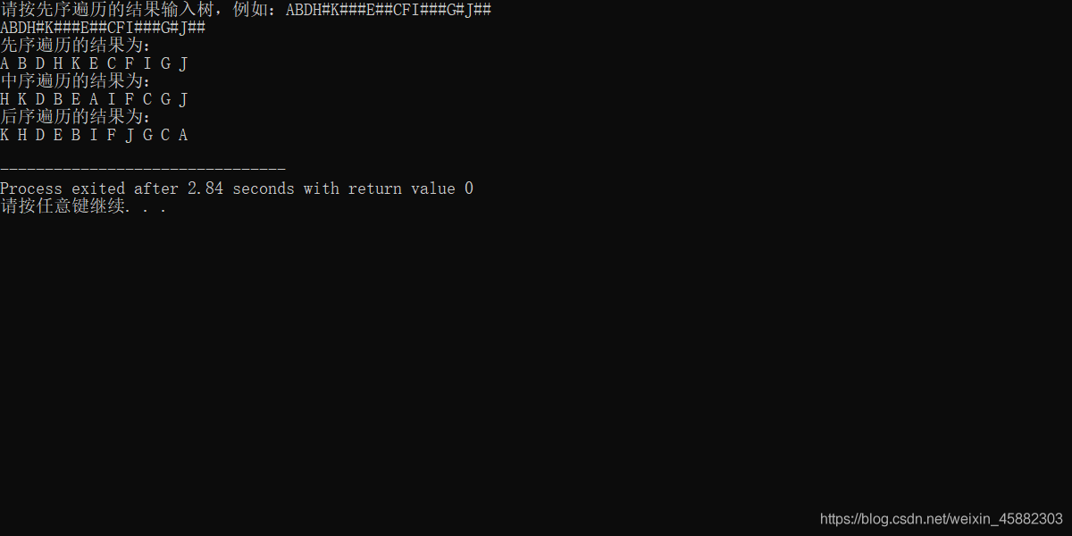 printf("请按先序遍历的结果输入树,例如:ABDH#K###E##CFI###G#J##\n");