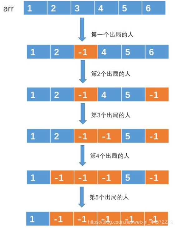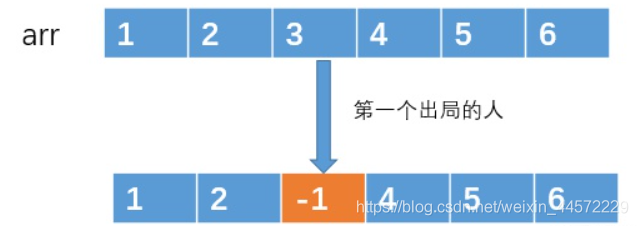 然后不停着遍历数组,对于被选中的编号,我们就做一个标记,例如编号 arr[2] = 3 被选中了,那么我们可以做一个标记,例如让 arr[2] = -1,来表示 arr[2] 存放的编号已经出局的了。
