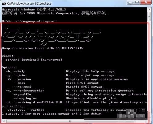 12、输入:composer 回车;出现下面信息,则表示Composer安装成功!