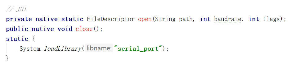 open和close标红没有影响,不用管它(因为我们直接so库用上了,没有新建jni文件夹这种操作所以才标红)。 System.loadLibrary加载的libname是.so文件去掉开头的lib三个字母后的名字(libserial_port.so => serial_port)