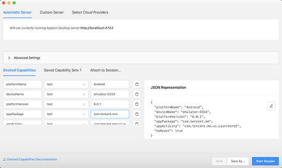 那么,我们怎么知道某个元素的 id 呢?这时候就又要请出我们的桌面版 appium 了。点击「启动成功」界面右上角的放大镜图标。之后将上述程序中的配置信息添加上去,最后点击「start session」按钮,不出意外的话你应该能看到微信启动界面了,就是那个地球。
