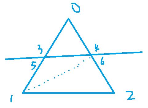2. 三角形与切割平面有两个交点,两个交点都在边上。这时,原有的三角形将被分成三个三角形,分别为:034、561、126。