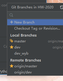 为了开发过程中尽量减少冲突,master分支用作最终的release,dev分支作为每日的开发和合并代码,然后每个人建立自己的分支,在自己的分支上进行开发,比如我的个人分支是dev_wyb,