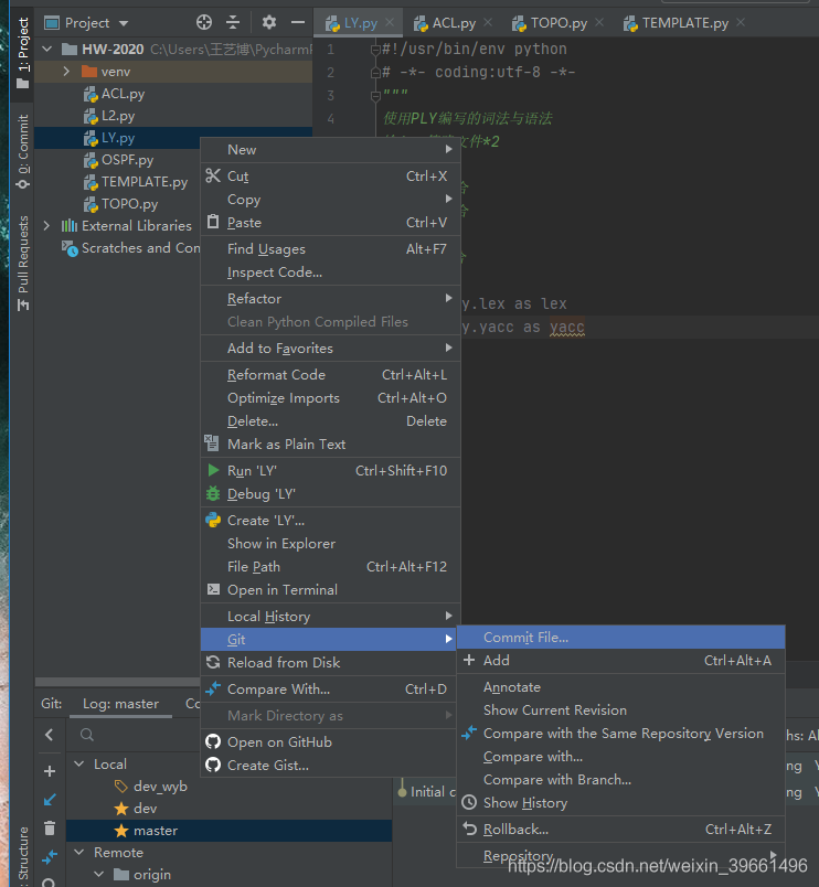 创建分支后在自己分支下进行开发,比如我在dev_wyb分支下修改了ly.py的代码,会显示蓝色